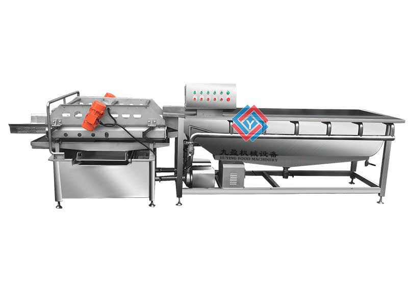 渦流洗菜機采用的是旋流式和氣泡同時清洗的模式,缸底部布置了高壓注氣管,高壓氣泡可以分離開抱成團的果蔬,可以解決傳統(tǒng)純漩流洗菜機的弊端,并且清潔的效果好,洗菜機不會損傷果蔬,結(jié)構(gòu)更加簡單,比傳統(tǒng)的輸送帶可以減少大量的清洗時間,使用起來更加方便,和物料接觸的輸送面采用了沖壓孔的設(shè)計,可以分離物料里的碎料,同時洗菜機配備了進(jìn)口的震動臂,震動的頻率高還比較平穩(wěn),雙排噴淋系統(tǒng)可以形成高密度噴淋,保證在清洗過程中果蔬更加干凈。